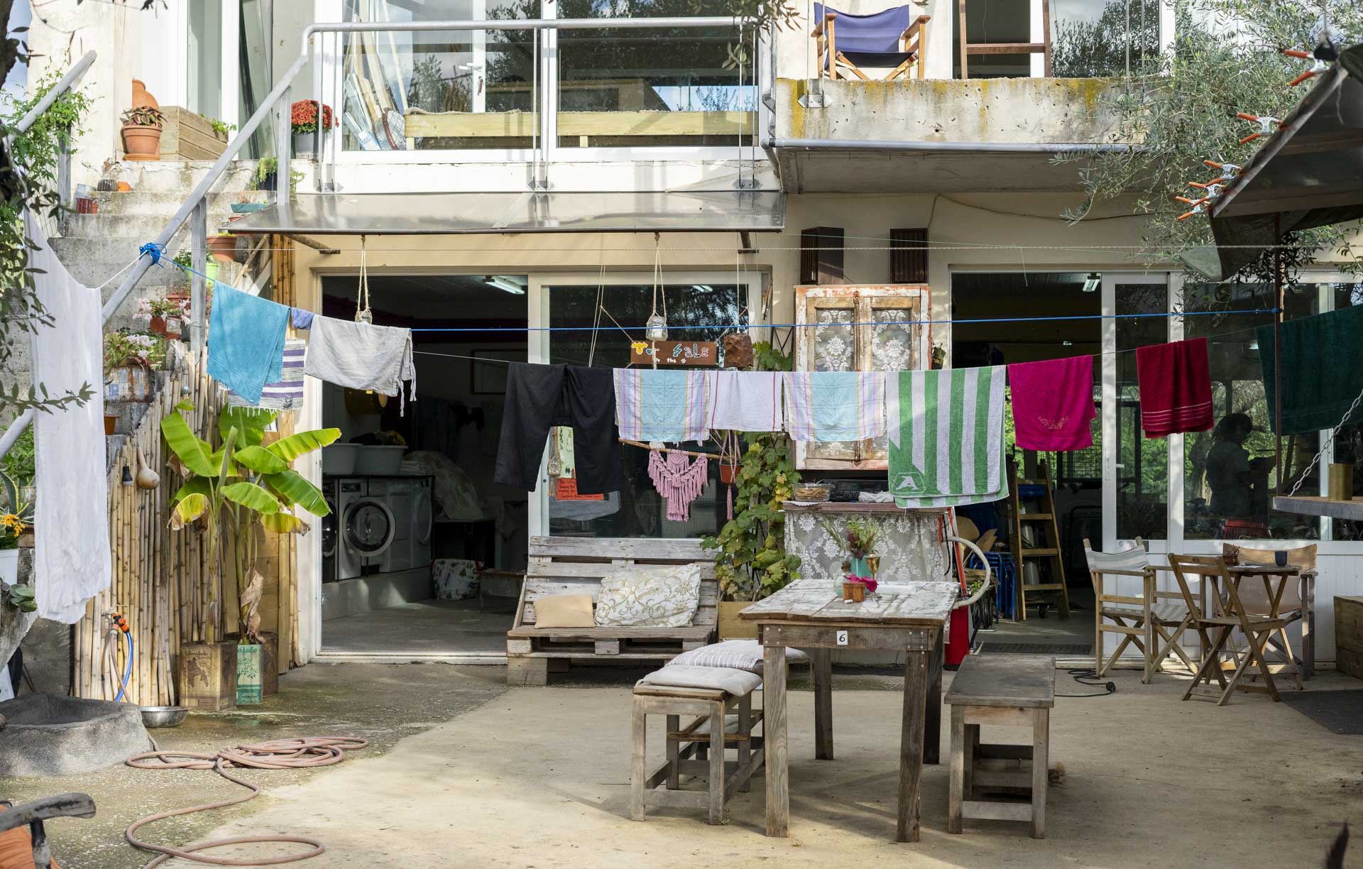In winter 2020 we opened a laundry shop in Kakovatos. Since then we have been renovating, building and creating a little oasis for travellers. With the help of many wonderful personalities who contributed valuable time and skills and made this place what it is: a meeting point and open space for people who want to get creative and share experiences.